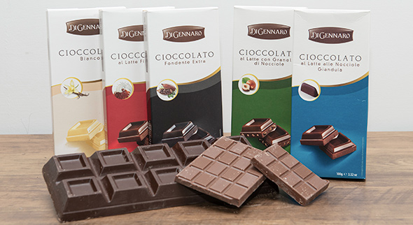 Fondente al pistacchio, Gianduia alle nocciole, Fondente alle nocciole, Latte al caffè, Fondente all’arancio.